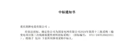 近日,重慶鴿牌電瓷有限公司在國家電網(wǎng)有限公司2024年第四十三批采購(輸變電項(xiàng)目第三次線路裝置性材料招標(biāo)采購)中,成功中標(biāo)2個(gè)標(biāo)包,中標(biāo)金額為1370萬元。