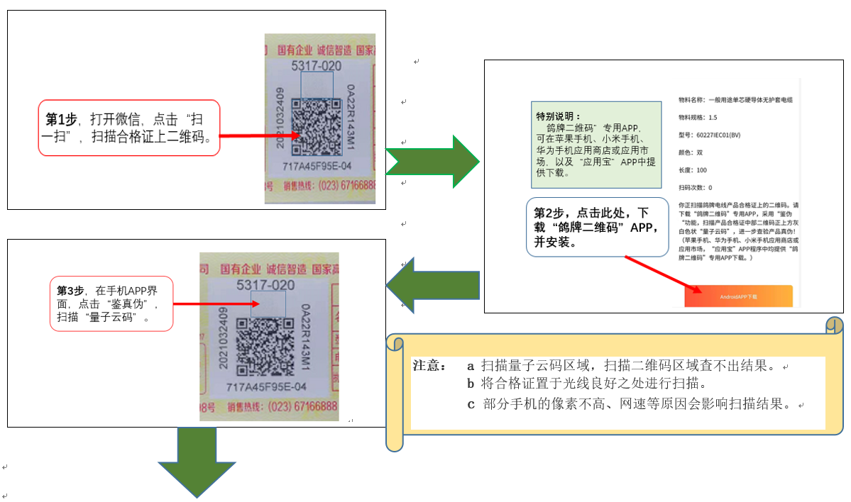 為保障您的權(quán)益,增強(qiáng)鴿牌公司電線產(chǎn)品的防偽和質(zhì)量追溯能力,我公司持續(xù)對(duì)電線產(chǎn)品的合格證及防偽系統(tǒng)進(jìn)行改進(jìn)升級(jí)。2020年1月啟用了鴿牌電線第三代防偽系統(tǒng),電線產(chǎn)品采用‘二維碼+量子云碼’合格證,淘汰采用電線產(chǎn)品的電話電碼防偽查詢系統(tǒng)。